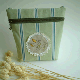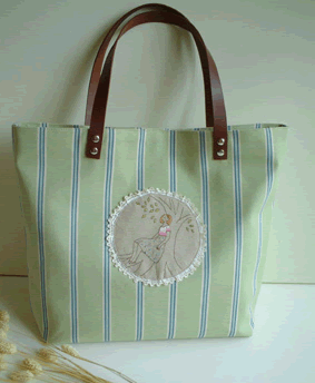 今回はピクニックに 連れて行きたい雑貨ということで、 大きめのトートバッグを作りました。 私が今まで作ったバッグでは最大かも。 底のサイズは約10センチ×30センチ。 まちもたっぷりなのでかなりの収納力です。 若草色のストライプのデニム地が ベース。 ポイントは木にもたれかかった 少女を刺繍したリネン。 シンプルなバッグです。 持ち手は革で、カシメで付けました。 |