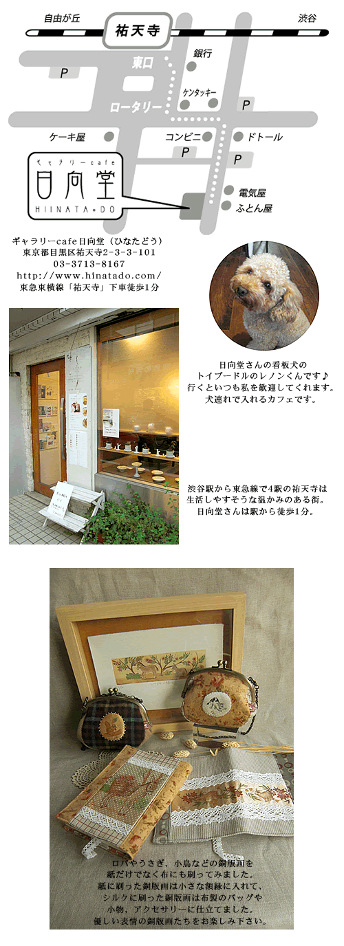東京・祐天寺のギャラリーカフェ「日向堂」さんで個展をします。 今回は9月の鎌倉の個展に出品した時にシルクに刷った銅版画を 「雁皮紙」という和紙に刷り直して新しく額装しました。 それからシルクに刷った銅版画を使って制作したバッグ、 がまくちポーチやブックカバー、携帯ケースなどを出品の予定です。 他にパステル画、2009年森 祐子カレンダーなどなど。 日向堂さんの美味しいメニューを堪能しながら、 *PUKU*森 祐子の作品をお楽しみ下さいね。